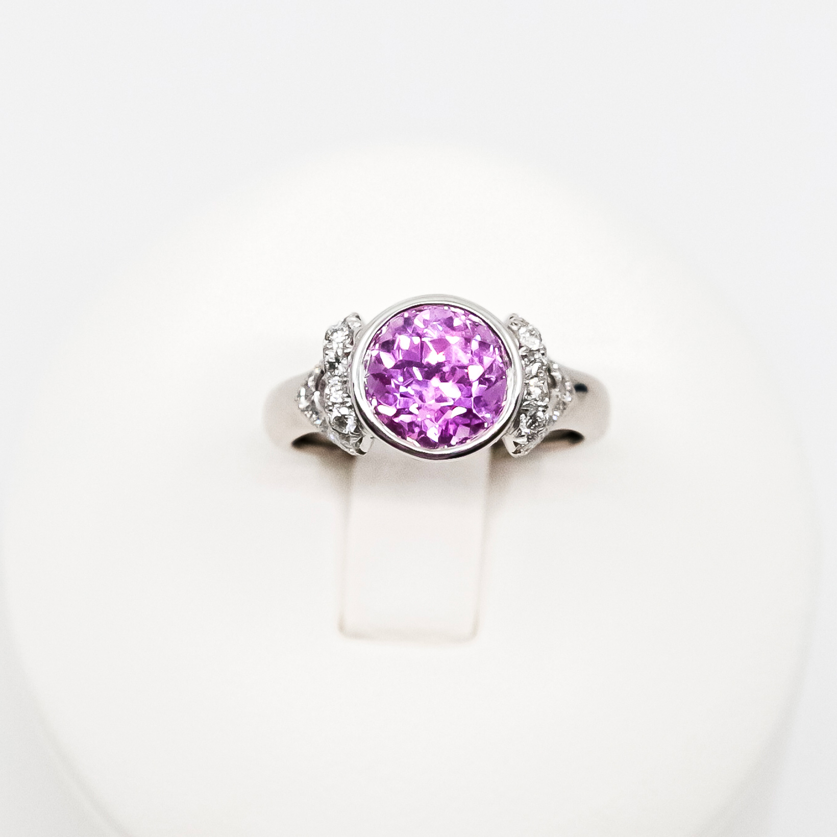 Bague en or blanc 750/PD avec saphir rose « coussin » non chauffé de 4.43 carats, sertie de 56 diamants taille brillant TW-VS et ressort intégré en or blanc 750/00. Poids 7.27 gr. Pièce unique fait main.